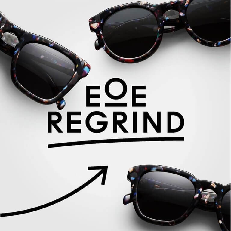 EOE Eyewear har utvecklat REGRIND, en glasögonkollektion tillverkad av återvunna bågar. Företaget samlar in uttjänta glasögon genom samarbeten med organisationer och industripartners och återvinner omkring 98 % av materialet i en process framtagen tillsammans med tekniska experter. Det återvunna acetatet pressas till nya materialplattor som används för att producera nya bågar, vilka kombineras med svenskt återvunnet stål (EU-patent). Den första REGRIND-kollektionen omfattar tre solglasögonmodeller och projektet har uppmärksammats genom en nominering till Stockholm Fashion Districts utmärkelse Encouragement for Action i kategorin Closing the loop.